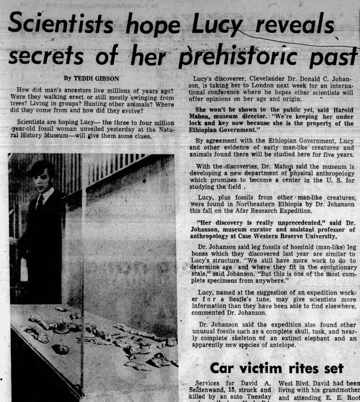 That’s why, right there in the headline. “Her.” She was a person. Lucy wasn’t even formally published yet, that would take several more years. She was still AL 288-1, being puzzled over in notebooks, behind closed doors. But already she was more than that — more than the specimen number, more than the data points. She was treated as someone the public might know.